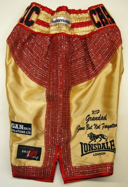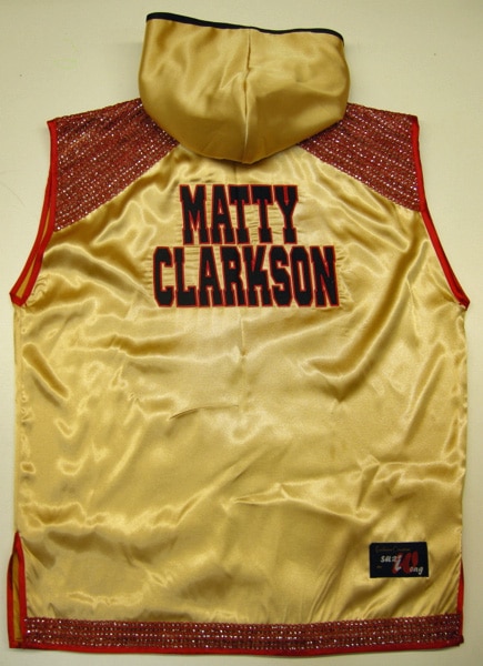 Matty wanted something along the lines of Thomas Stalkers shorts and ring jacket but in his own colours and style.  We added the mexican trim in the same shape but kept the shorts satin to keep down the overall weight.  For something similar in your own colours, with your own embroidery and fabric, let us know what you require and we will get back to you with a price.  Use the contact us button or a design your own template and we will get back to you with a quote.