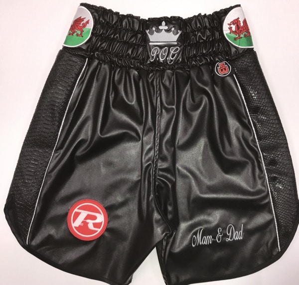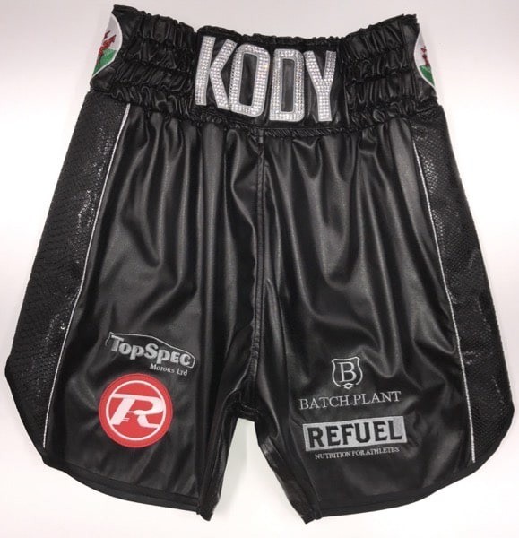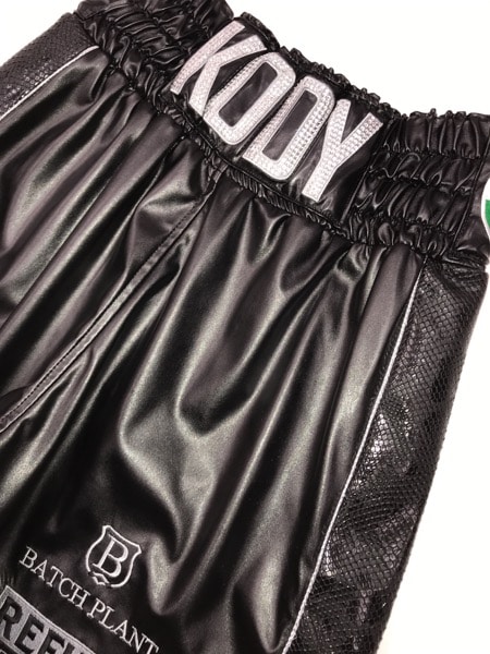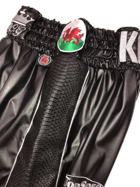 Welsh GB Star Koby mens black leather and snake boxing shorts with Austrian Crystals crystals names and silver trim.
