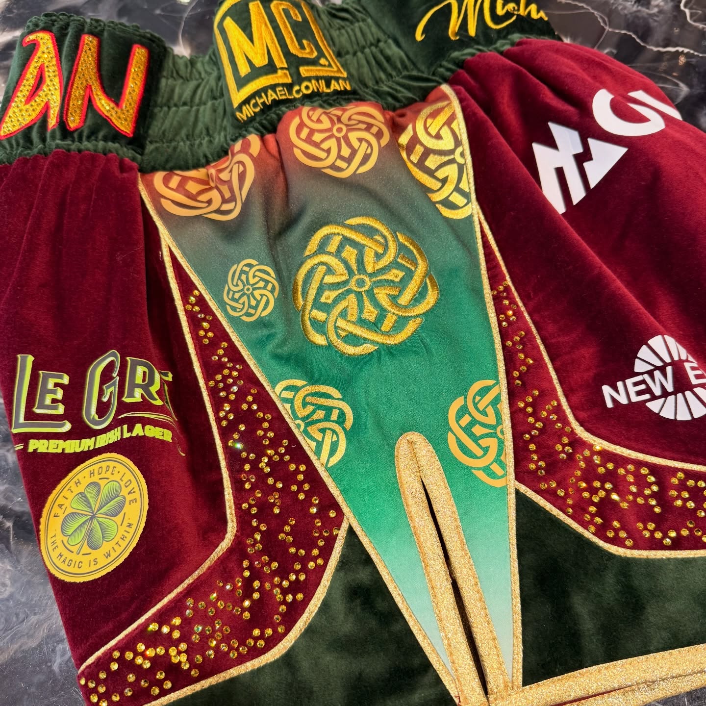 Designing Custom Boxing Kit for iconic Irish fighter Michael Conlan is always a privilege for the Suzi Wong Team. For St Patrick’s weekend, we created a standout Bespoke Boxing look in rich burgundy and forest green velvet, finished with metallic gold trims, crystal detailing and Irish knot motifs.