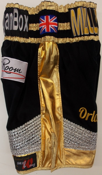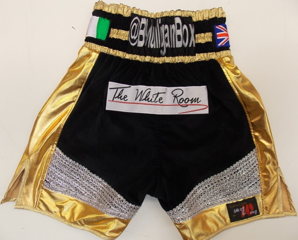 Ben Mulligan came to see us at our studio to design and make his pro debut boxing trunks.  We opted for black velvet, with gold wet look panel and silver mexican trim.  Ireland and Great Britain flags embroidered on the waistband with outline names.  Really nice design we did here with the extra mexican silver trim.  We can make something similar in your own colours and fabrics.  Have a look through the site to get some ideas of colours and fabrics you like.  Let us know what you require on the contact us button at the top of the page and we will get back to you with a price.