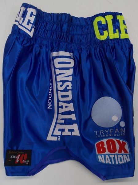 Nathan Cleverley wanted a short and specific shape to his shorts as he finds them comfortable when boxing.  These are a blue satin short, with sponsors logos and illuminous yellow embroidery and headband.  We can make these in any fabric or colours you require with your own names on and sponsors logos.  Just let us know what you require either on the contact us button sending an email, calling us or filling out one of our design your own templates and sending it back and we will provide a quote.