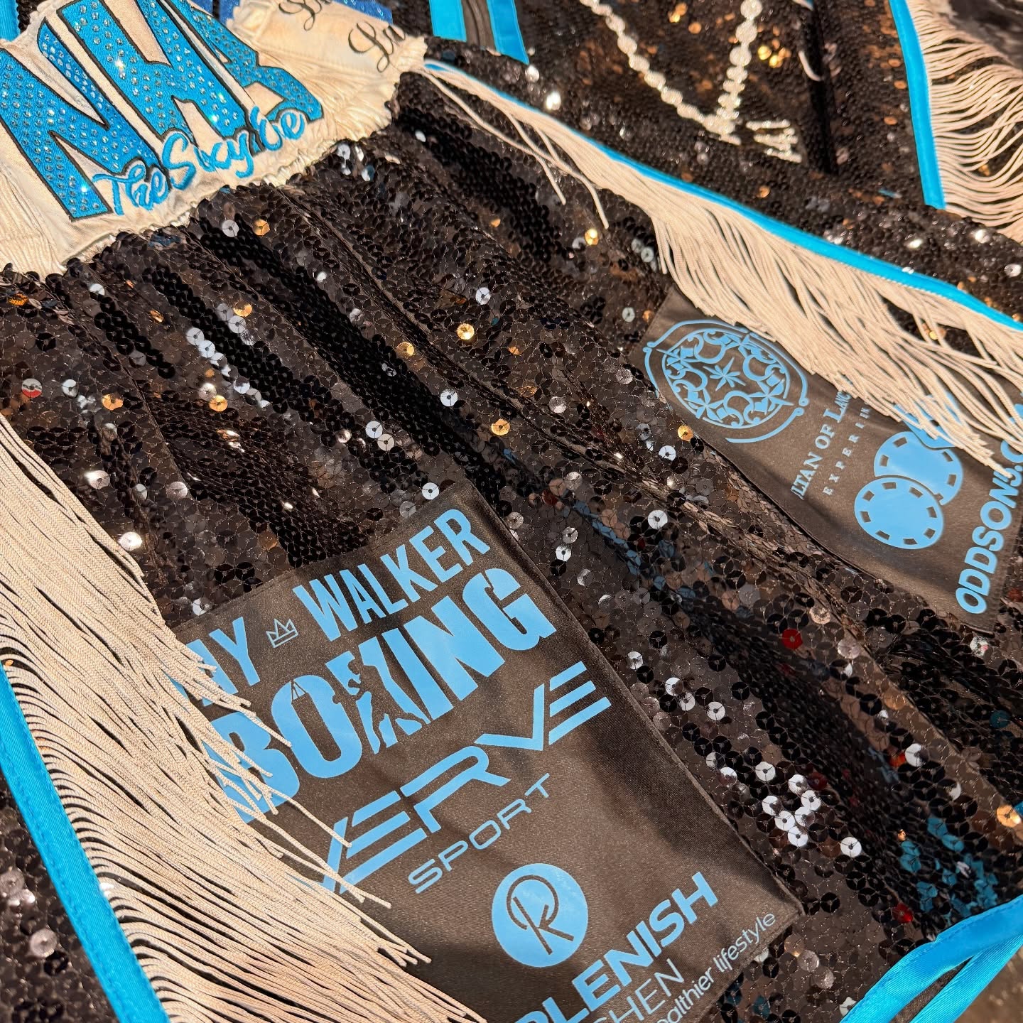 This project was all about impact: Nelson wanted a premium look that felt modern and sharp, without sacrificing the performance features needed in elite competition. The Suzi Wong Team developed a concept that combines a black sequin base with metallic silver panels, finished with electric blue trim and tassel detailing—an unapologetically bold aesthetic built on a technically robust foundation. As with all our Bespoke Boxing work, the final design was refined to suit Nelson’s ring presence, stance and movement so the kit looks as good in motion as it does in stills.