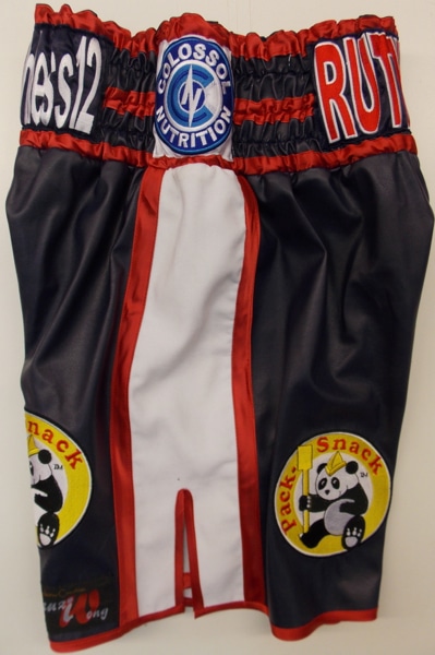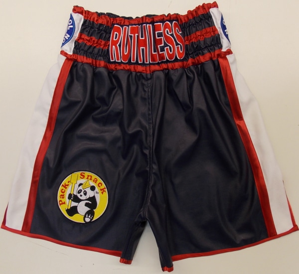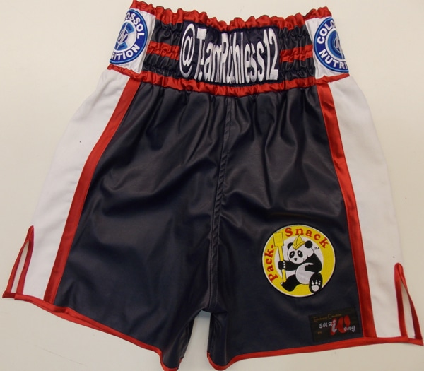 Ryan Doyle went with and dared to go for something new with out new navy blue leather style fabric, with red trim and white velvet. The shorts really stood out and in the shorter classic style, give that old school retro feel to the custom boxing shorts. We embroidered his sponsors onto the shorts and also produced a range of corner t-shirts with his sponsors on as well. We can make something similar in this style for you, in your own colours and fabrics or the ones shown. Just let us know what custom options you want using the contact us button, embroidery, fabric colours, etc and we will come back to you with a quote.