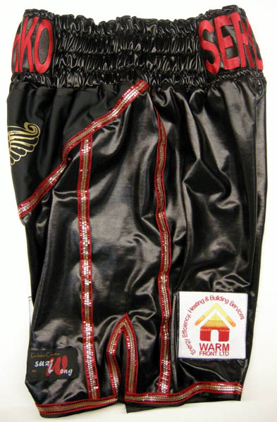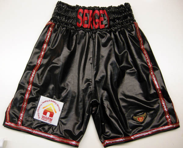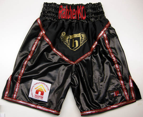 Black wet look boxing shorts with red fancy trim.  Rabchenko has been training with Manchesters Ricky Hatton and making steady progress in the pro’s fighting fighter like Ryan Rhodes, etc. If you want something similar you can have the shorts in any material, wetlook, velvet, satin, sparkle.  Just let us know what you require using either one of our design your own templates or on the contact us button at the top.  Put all your details down, what names you want on the front, back etc, fabric, colours and we will get back to you with a price.  All our items are custom made and therefore require a custom price.