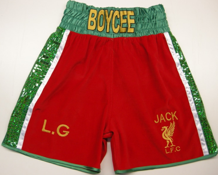 Red Velvet, green sparkle, white trim custom boxing shorts with outline embroidery names.  A traditional style but very effective and great looking.  We can make these shorts in any colour, fabric, with any embroideries you require.  Let us know what you require using the contact us button, one of our design your own templates or call us for a quote.