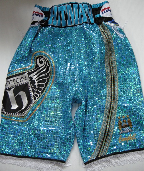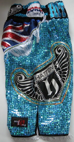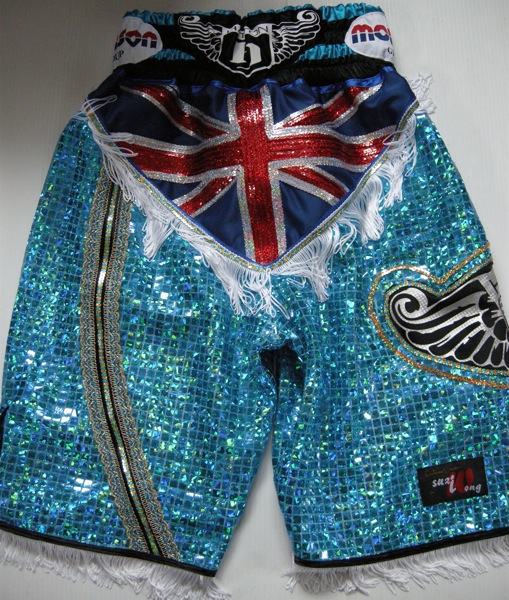 Ricky Hatton vs Pacquiao was a massive fight in the USA and we made two pairs of shorts for Ricky for this fight to choose which colour he would find best to fight in on the night. We added his custom tassels and Union Jack on the bum, with his logo on the side. If you want something similar you can have the shorts in any material, wetlook, velvet, satin, sparkle. Just let us know what you require using either one of our design your own templates or on the contact us button at the top. Put all your details down, what names you want on the front, back etc, fabric, colours and we will get back to you with a price. All our items are custom made and therefore require a custom price.
