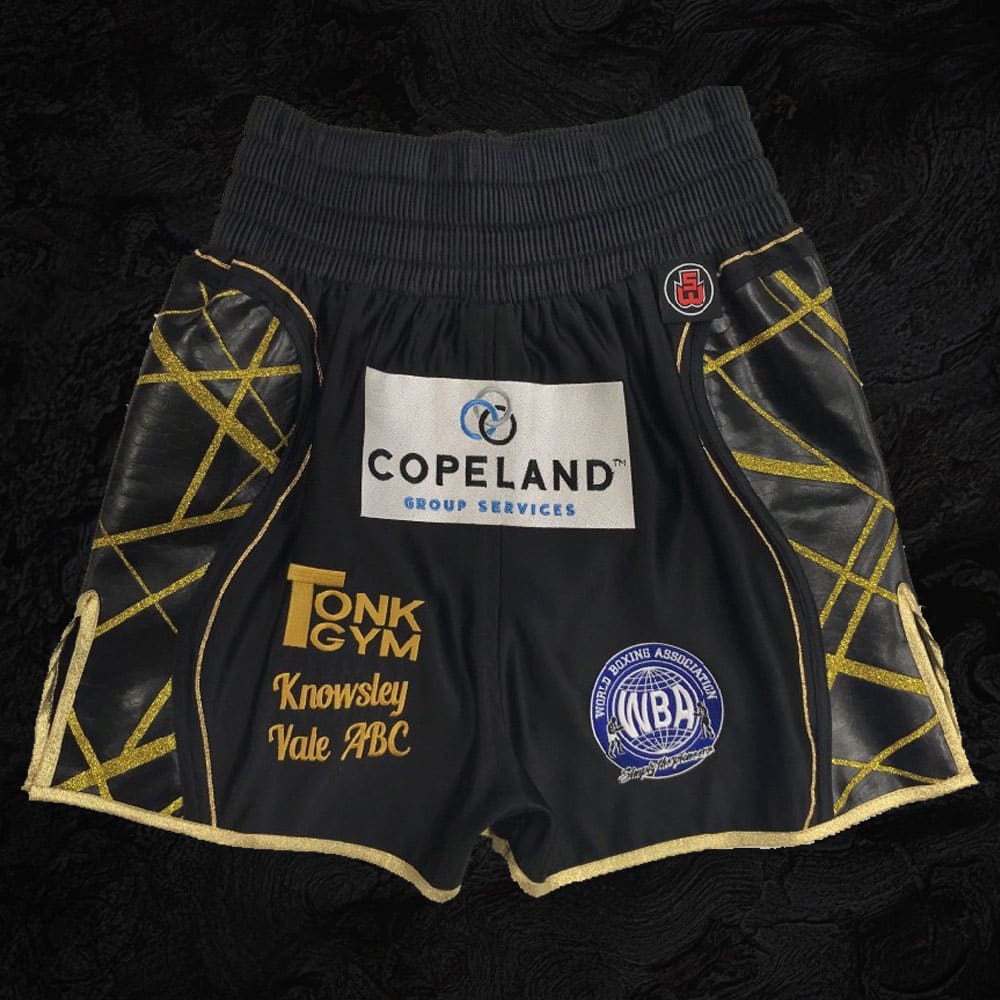 We trimmed the ring jacket and boxing shorts with black snake skin and then on top of this had gold sparkle, with random hand placed gold Austrian Crystals crystals over.