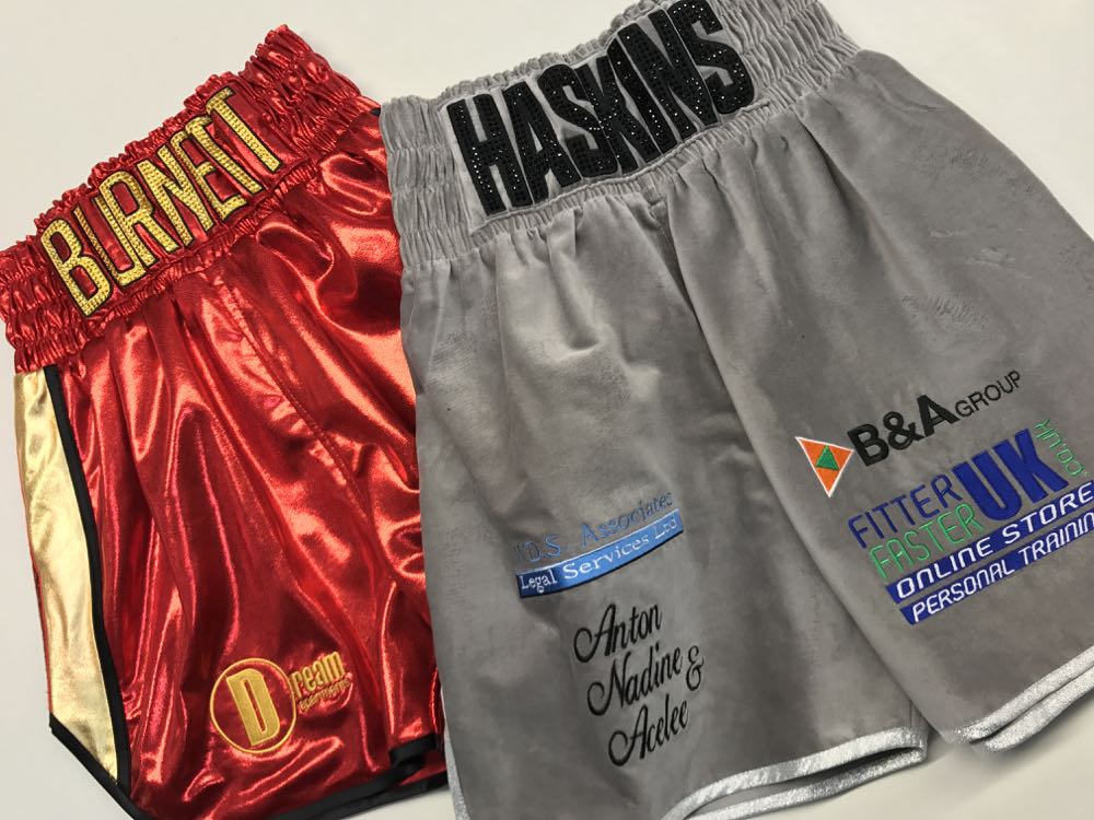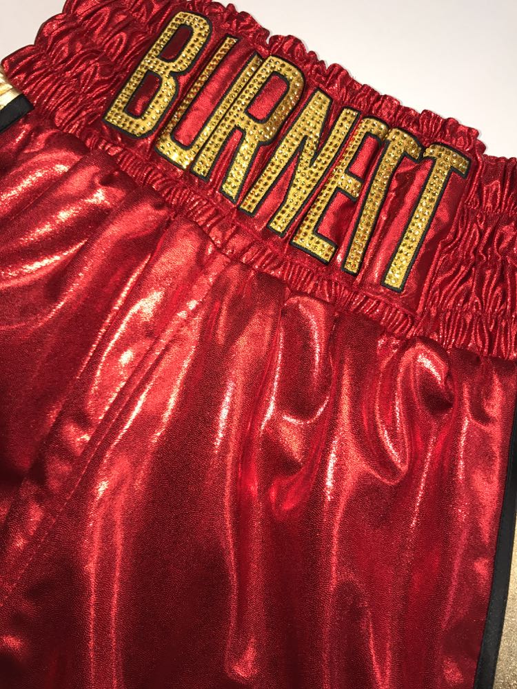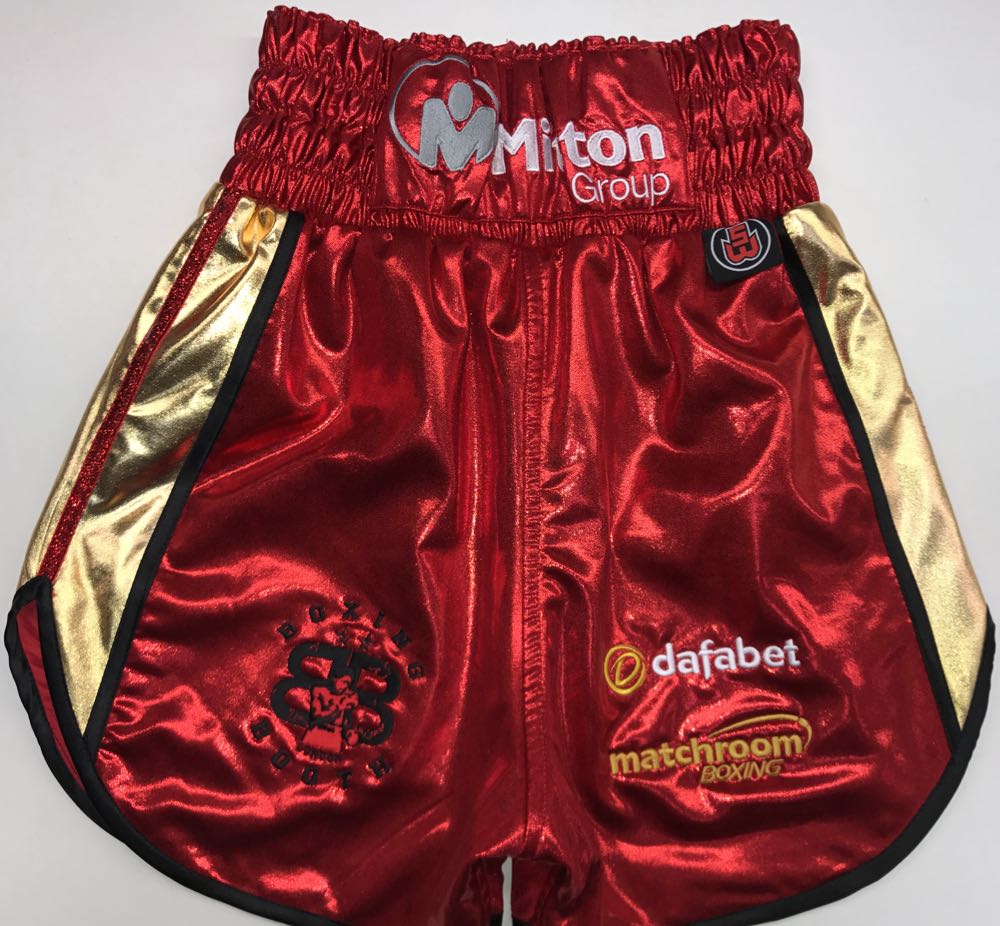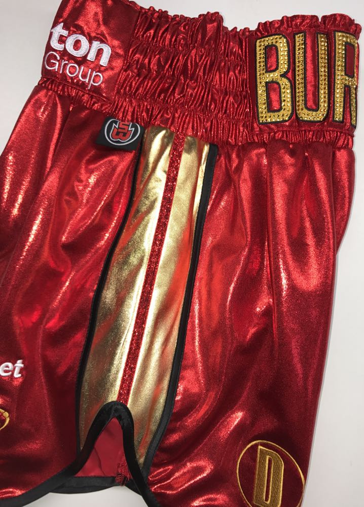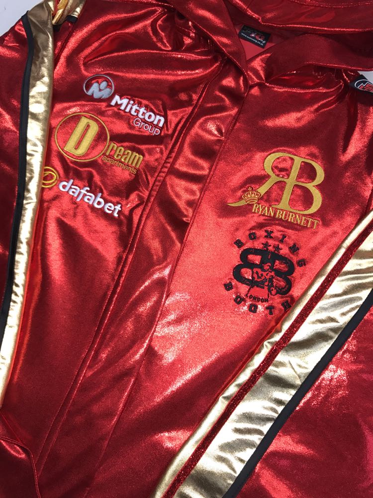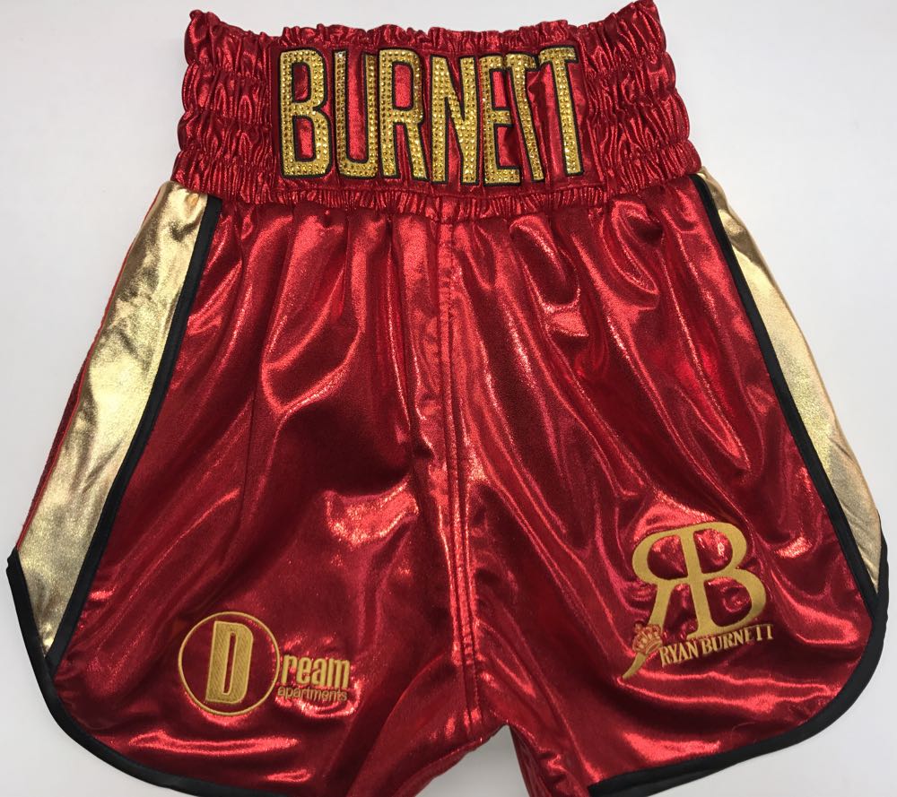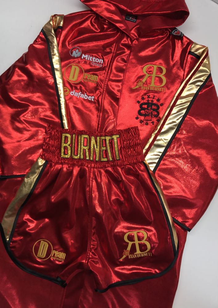 Ryan Burnett wanted something special for his big night in Belfast fighting Lee Haskins for the IBF World title. His fight kit he wanted to be the colours of the beautiful IBF belt of red and gold, so we went for a classic design, trimmed in black with a curved style and Austrian Crystals name to sparkle under the bright lights. Its been a great honour for us to design both fighters kit for the big occasion. We advised Ryan to have a gown, a classic Ali style, keeping him warm going to the ring and making a big reveal of his shorts when he takes it off. We also provided Ryan with matching black and red socks available from our store here Suzi Wong 2017