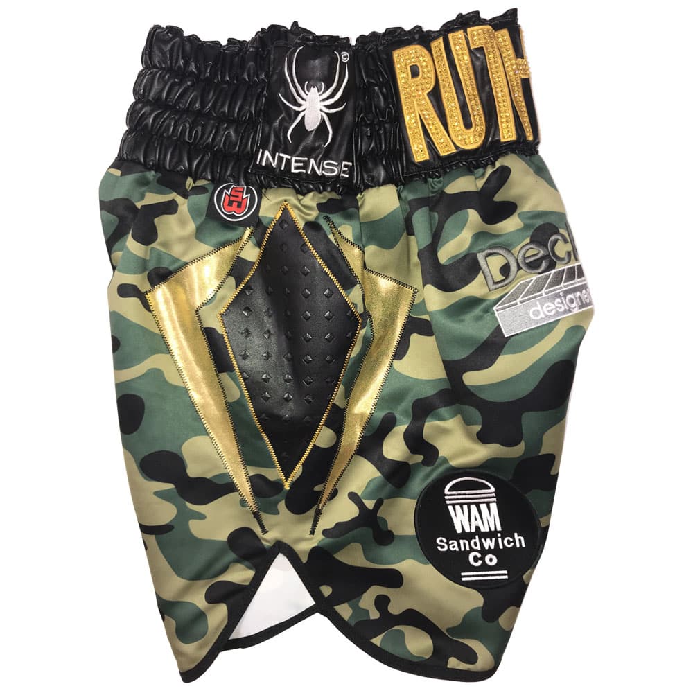 The kit for the evening is a custom print camo fabric, trimmed in stud black leather, gold wet look and Austrian Crystals crystal name on the front, that really bling under the bright lights of the boxing ring.