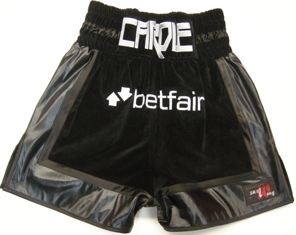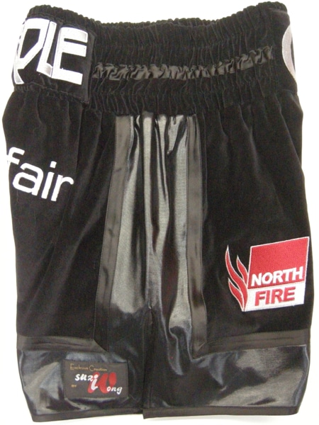 Scotty Cardle wanted something a little different and went for a black on black theme here, mixing velvet and wetlook together.  He also went for an old school thin style poncho, that just goes over the head.  It all worked well together with the shorts style shorts to match.  Tyson in the making??  For something similar please contact us useing the contact us button at the top of the page.  Let us know what you require, colours, fabrics, names etc and we will get a price back to you.