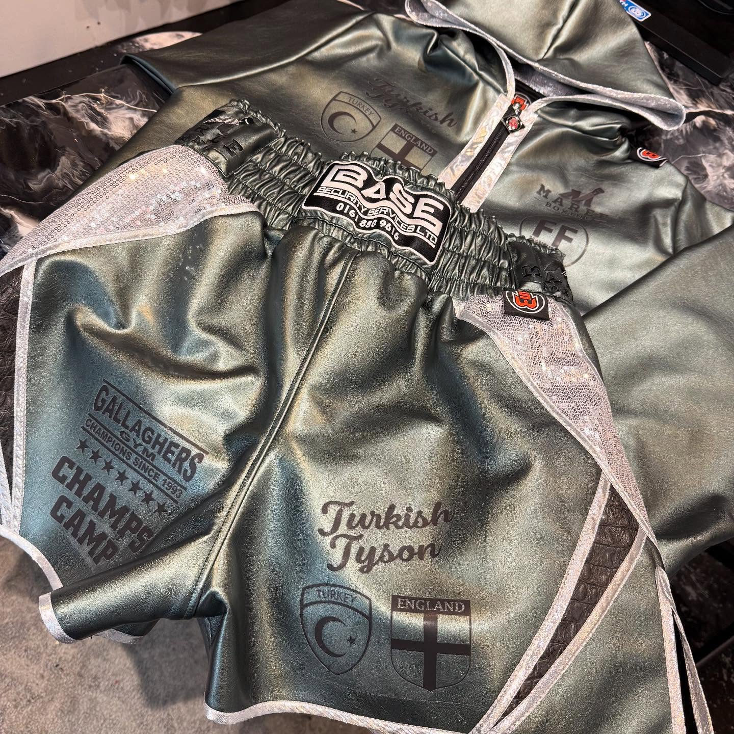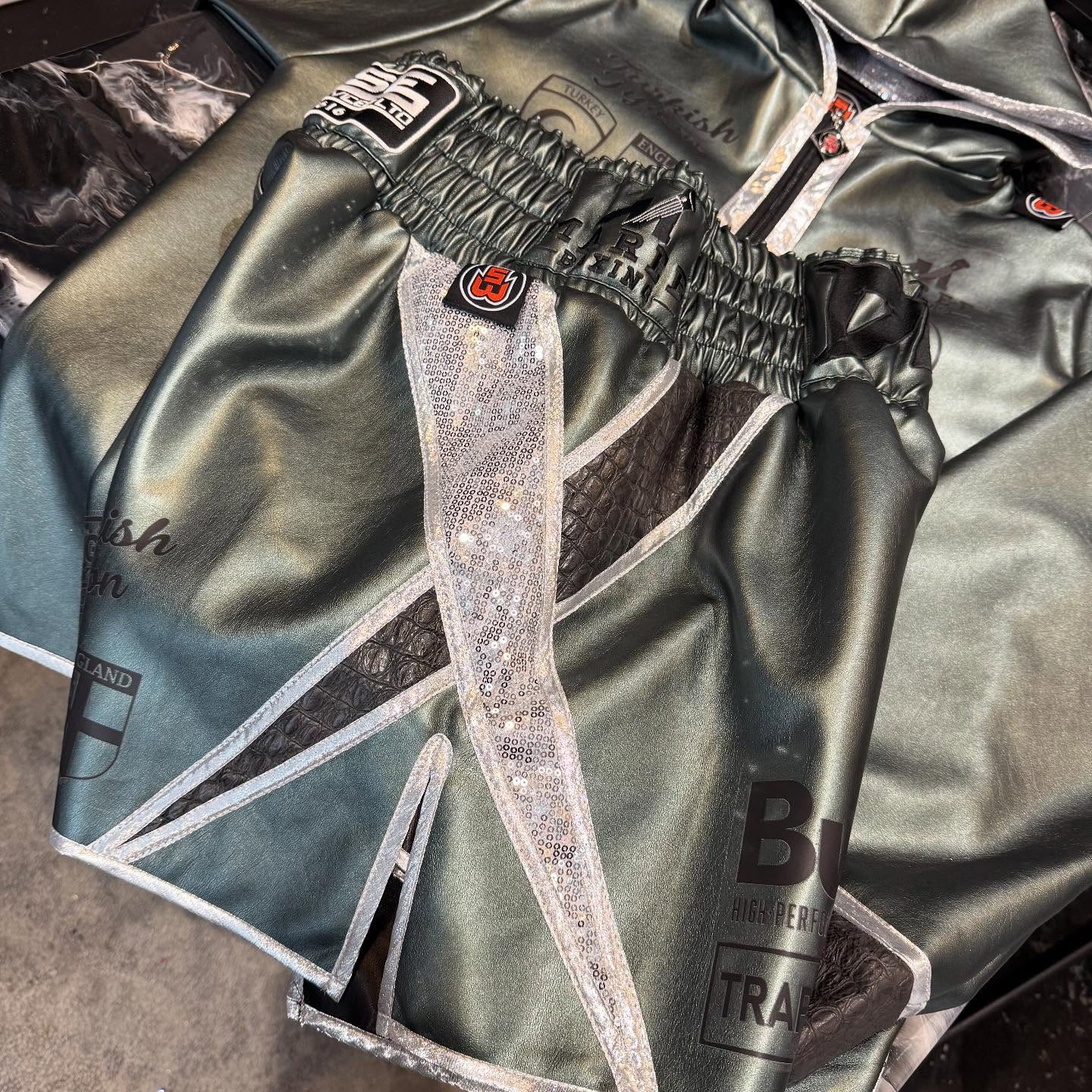 We chose a luxurious metallic green leather as the base material of the boxing shorts, adding a touch of glamour that stands out under the arena lights. This was complemented by grey crocodile leather trimming, enhancing the overall aesthetic with subtle elegance. The silver shimmer accents served to catch the eye, ensuring that Billy would be the centre of attention. Our emphasis on bespoke boxing ensures that every element meets the highest standards of quality and durability, perfect for the rigorous demands of professional boxing.