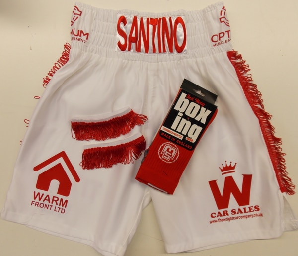 Sonny Upton wanted something basic but classic with a white satin shorts and red tassels down the legs. We also made him some special boot elastics to go over his boots and give that extra bling feel to the whole outfit, with his matching Suzi Wong socks also. Socks are available in 4 different colours from our online shop just click the link above. We can make this style short in any colour, from any fabric, wetlook, velvet, satin, sparkle etc. We can also embroider your own name and logos on the shorts, just let us know what you require and we will get back to you with a quote. You can let us know either using one of our design your own templates you just need to print off and fill in to send back to us, or you can send us an email using the contact button at the top of the page. You can also ring us with your queries and we will do our best to help you choose the right boxing shorts, ring jacket, t-shirts and anything else clothing wise you need.