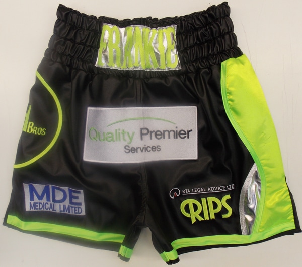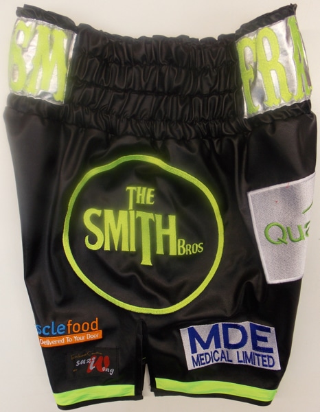 Specially designed boxing shorts for Stephen Swifty Smith for his ring return in Sheffiled. We went for some different colours using electric lime green, black leatherette, witha silver wetlook panel. We also used a new font on his name on a wetlook silver patch. This design worked really well and left enough room for all Stephens sponsors and the Team Smith Bros logo to be big on the side as Paul and Callum had has previously. This design could work well in lots of different colours and fabrics. We can make simialar boxing trunks with your own names and sponsors on them in your own colours, just using this or any of the style on our website to suit yourself. Just let us know what you require, colours, fabrics, names, sponsors, etc and we will come back to you with a quote. You can use the contact us button at the top of the page to describe the boxing shorts you like or print one of our design your own templates off to fill in and send back to us. We are also available on the phone, numbers above, for information and advice.