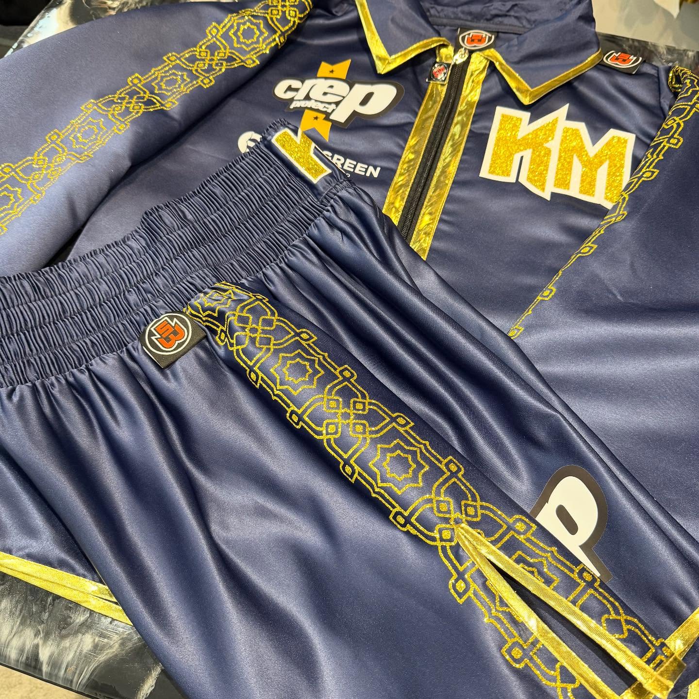 The journey of creating Khaleel Majid’s boxing kit was a true collaboration between our skilled team and the boxer himself. Khaleel’s vision of elegance and sophistication led us to select navy blue duchess satin, trimmed in gold, which not only enhances the overall aesthetic but also provides a luxurious feel that stands out in the ring.