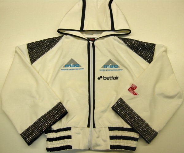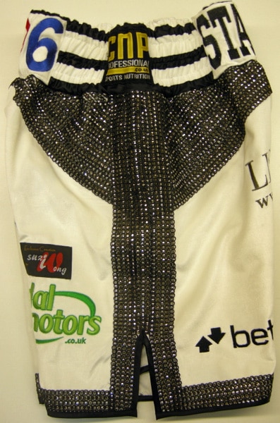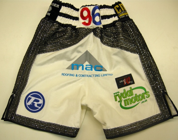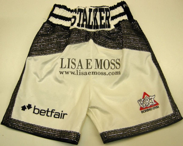 Thomas Stalker White and Black mexican trimmed styled boxing shorts and bomber ring jacket. Worn for his pro debut, the successfull and captain of the 2013 Olympic Gb boxing team wanted to wear white. We added all Captain Tom’s sponsors icluding Lisa E Moss. If you want something similar you can have the shorts in any material, wetlook, velvet, satin, sparkle. Just let us know what you require using either one of our design your own templates or on the contact us button at the top. Put all your details down, what names you want on the front, back etc, fabric, colours and we will get back to you with a price. All our items are custom made and therefore require a custom price.