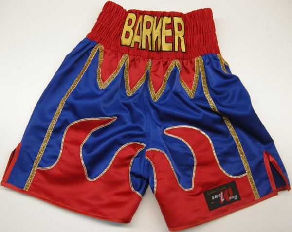 Titch wanted some flames in the traditional amateur boxing colours of red and blue.  We added sequin tips to make the flames look like there are moving in the wind.  If you want something similar you can have the shorts in any material, wetlook, velvet, satin, sparkle.  Just let us know what you require using either one of our design your own templates or on the contact us button at the top.  Put all your details down, what names you want on the front, back etc, fabric, colours and we will get back to you with a price.  All our items are custom made and therefore require a custom price.