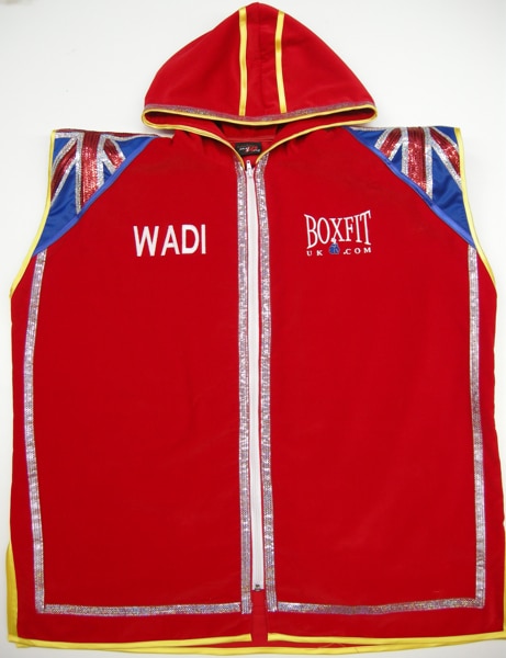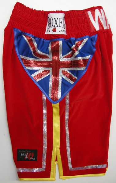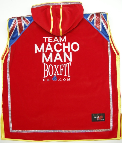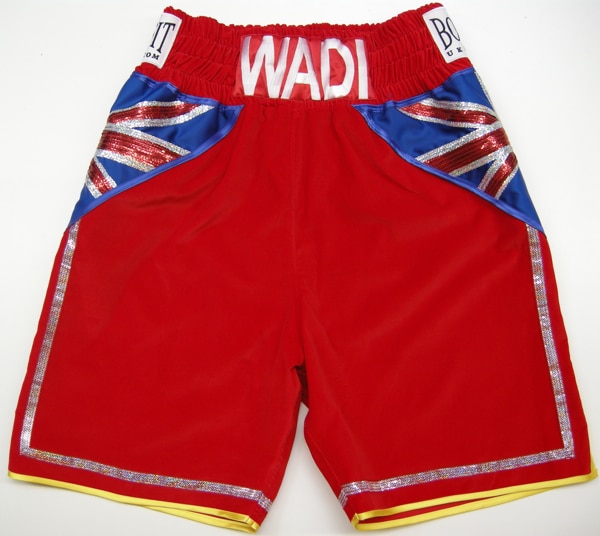 Red velvet boxing shorts and sleeveless ring jacket, with sequin Union Jacks on made for Wadi Camacho.  Trimmed with yellow and silver to set it off.  You can have something similar with your own names on, flags, colours, etc just let us know what you require using the contact us button or fill out one of our tempaltes with your own design and we will get back to you with a price.