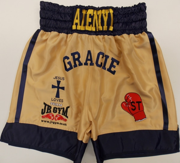 Wayne Adeniyi came over from Liverpool to see us as he wanted something very specific to represents himself and his roots. We went for gold and navy blue some of his favourite colours for the shorts and bomber style ring jacket. Wayne is a devout born again Christian so we embroider the cross on his shorts and hood of his ring jacket, along with an outline of Africa and UK on the arms of the ring jacket. This was something new and unique to Wayne. For something similar or if you have very specific ideas on what you require just give us a call and book an appointment to come and see us. If you cant come and see us, just let us know what you require using the contact us button at the top of the page. Colours, fabrics, embroideries etc and we will get back to you with a quote.
