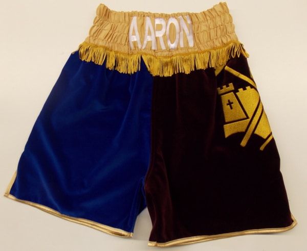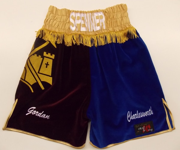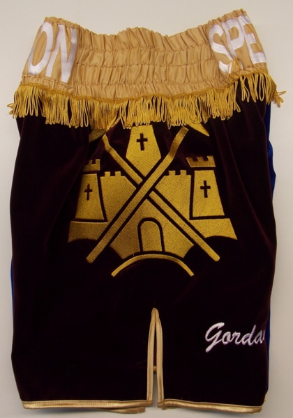 West Ham inspired shorts with the castle and hammers embroidered on the side of the boxing shorts.  We made the shorts from blue and maroon velvet, trimmed in gold with gold tassels.  We can make these shorts in made colours velvet if this is your chosen fabric, or we can make them in your chosen fabric.  Let us know what you want either using a design your own template, or sending us an email with what you require or give us a phone call to discuss your design and receive a quote.
