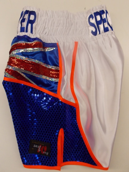 A nice clean style using white satin and a sequin Union Jack on the bum with the back short and front panel blue sparkle, trimmed in orange.  The orange really makes the colours and fabrics pop and work well together.  We can make these shorts with any national flag and any colours of fabrics you require.  Just let us know what you require either on an email, design your own templates of giving us a call and we will get back to you with a quote.