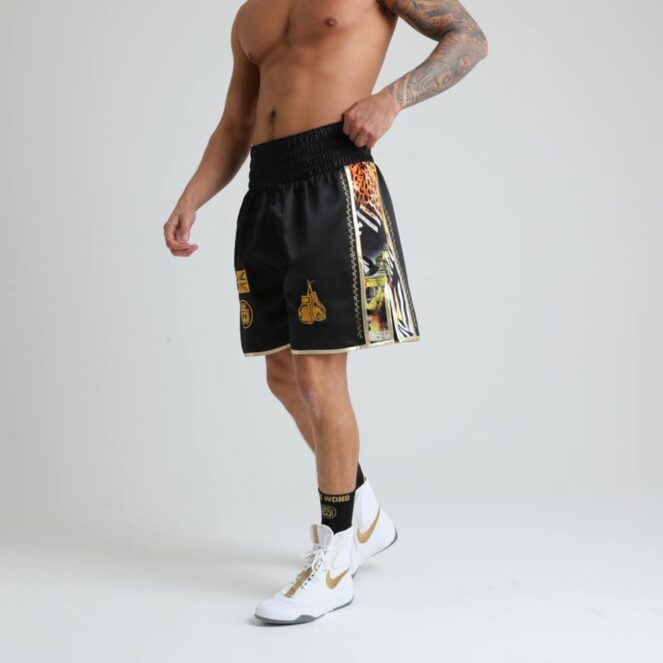 Stand out from the crowd and sparkle in the ring, with your Fightwear adorned in hundreds of luxury gold crystals. Made from luxury black satin and trimmed in gold jungle geometric pattern. The kit is highlighted with gold trimmings and Austrian crystal detail.