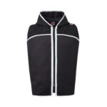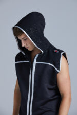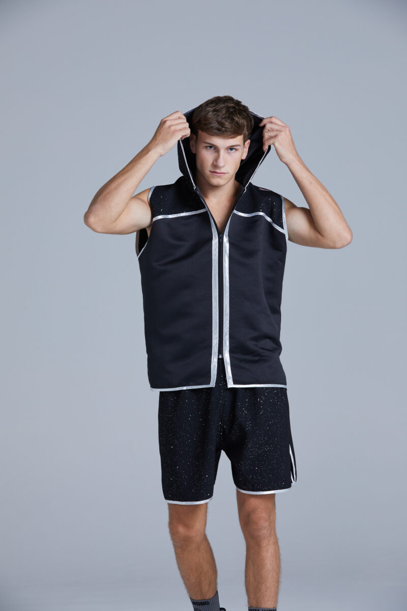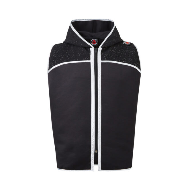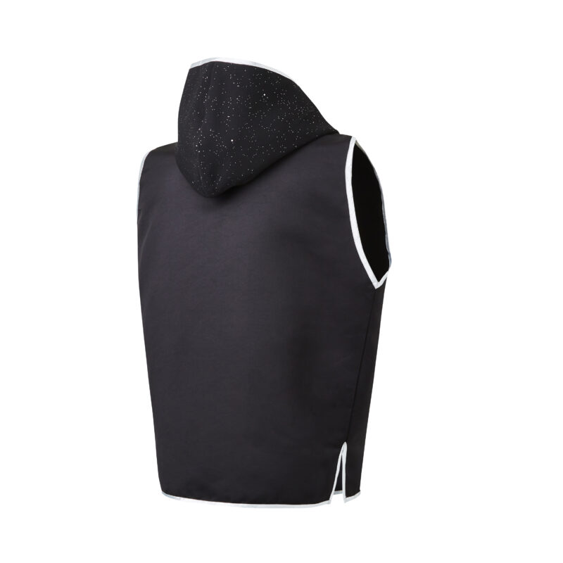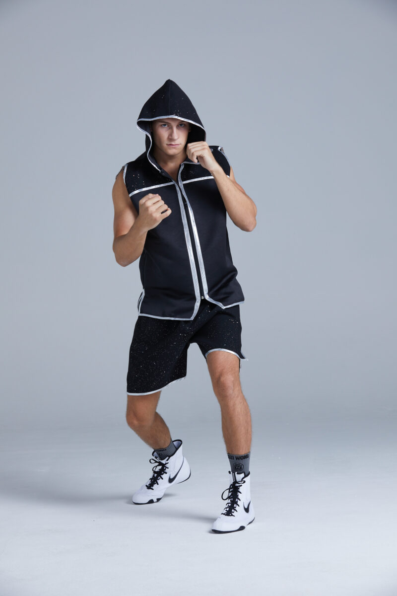 This black satin boxing ring jacket has black sparkle velvet to the upper shoulders and outer hood. The jacket is trimmed in silver.