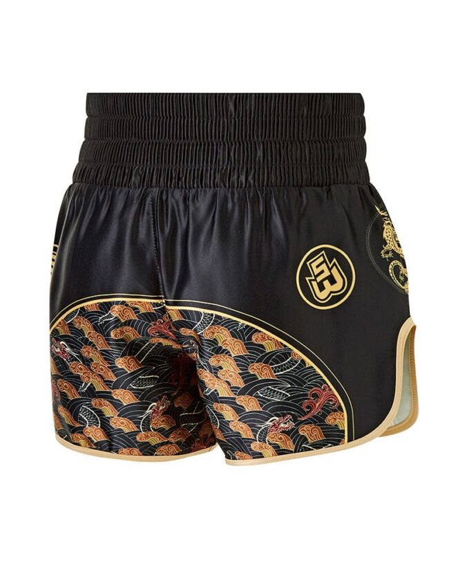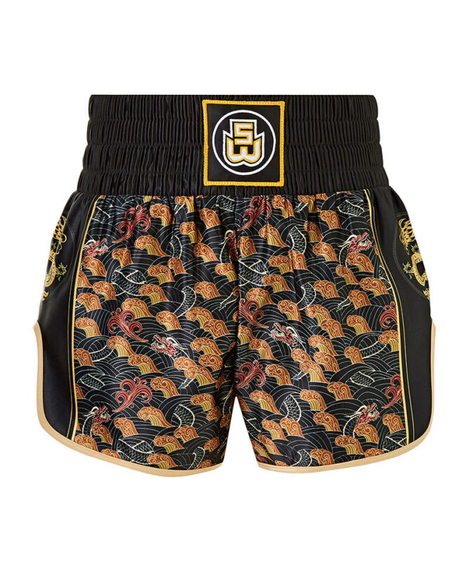 The fully sublimated print includes the traditional Lucky Dragon and Japanese style wave fabric. Popular with many Muay Thai fighters the dragon symbolizes perfect balance across Asia.