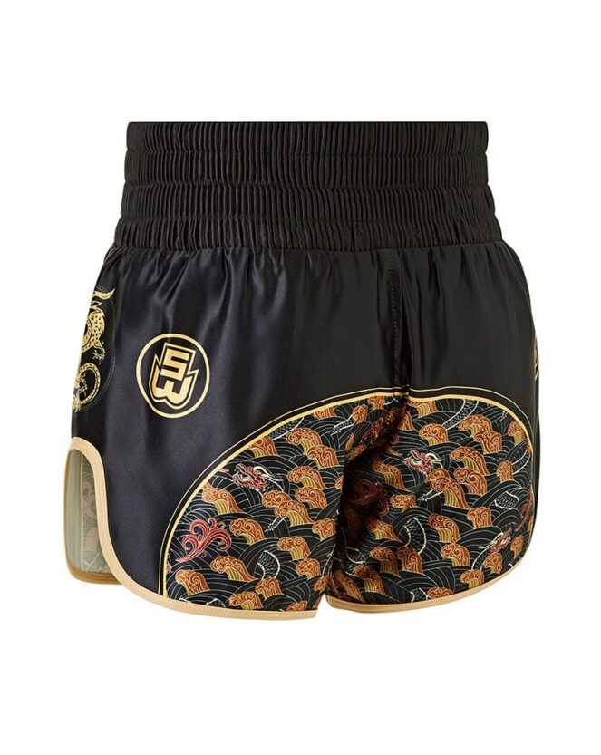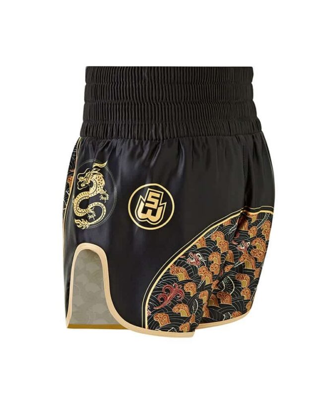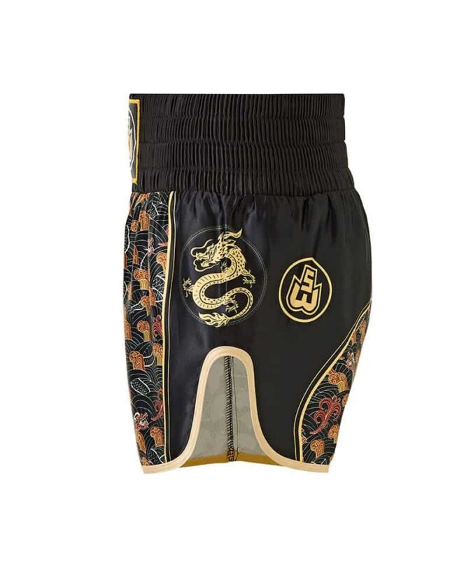 The Suzi Wong Black and Gold Muay Thai fight shorts are made to a traditional Thai design, designed and made in UK.